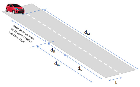 where is the distance traveled by the car during the time interval corresponding to the driver reaction time, i.e., with is the reaction time of the driver. Typical values for vary from s up to s depending on the driver physical characteristics. The in (12) is the distance required for stopping the car. It can be estimated by the following approximated formula [34]: