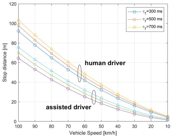 For the human driver case, we can assume that the car is proceeding at the corresponding constant speed and the driver is able to see the crossing point and act accordingly in the case of pedestrian crossing. In the case of automated assisted braking we could assume that for the verification of pedestrian crossing is left to car sensors, e.g., a car radar able to detect the presence of obstacles in the close proximity. As an example, from Figure 15 the could be set to m corresponding to a car speed lower than about 30 km/h for a human driver.