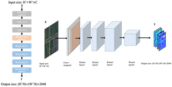 ∈ is input at the beginning of the network. The first process is three convolutions and one max-pooling, and then it comes to the feature extraction based on ResNet101. After three downsamplings, the output F ∈ is generated.