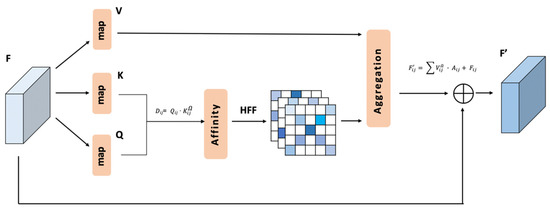 In the RCCA module part, the local feature map F∈ , the output of the backbone part, is mapped to K ∈ , query Q ∈ and value V ∈ (see Equation (2)).