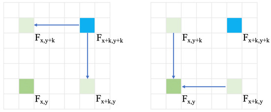 P1 and P2 are two points on the road, while S1 and S2 are two points on the non-road part. S1 and S2 are in the vertical and horizontal directions of P1 and P2. Using a recurrent mechanism [8], the relation between P1 and P2 needs to contain the transitions in S1 and S2, which can be described as P1S1P2 and P1S2P2. In the similarity calculation, by processing the feature vector, the similarity of P1 and S1 is . The similarities of S1 and P2, P1 and S2, S1 and P2 are and , respectively. The similarity of P1 and P2, which is directly calculated by the feature vectors, is . Due to the heterogeneity of S1 and P1, is relatively smaller than . Moreover, and are also relatively smaller than for the heterogeneity of corresponding points. In the recurrent mechanism, the similarity of P1 and P2 will be , which can be regarded as the second-order small amount compared to , which is why the recurrent mechanism will lead to the distortion of similarity. In the methodology section, we will illustrate this in detail by the formula.