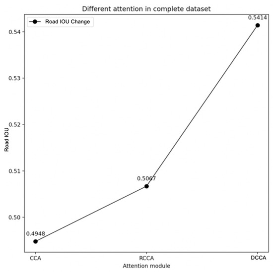 Figure 26 shows that the CCA module has a relatively poor performance when dealing with sloping roads and rotated-crisscross shaped roads. Meanwhile, the RCCA module will miss some road parts when the roads are crisscrossed. The output of the DCCA module complements the advantages and disadvantages of the CCA module and RCCA module. Through the SAF module inside the DCCA module, a larger weight can be assigned to the RCCA module on inclined roads, while a larger weight can be assigned to the CCA module on horizontal and vertical roads to obtain the best results in the end, which is the reason why the DCCA module can adaptively focus on roads of different shapes, and the result is the best.