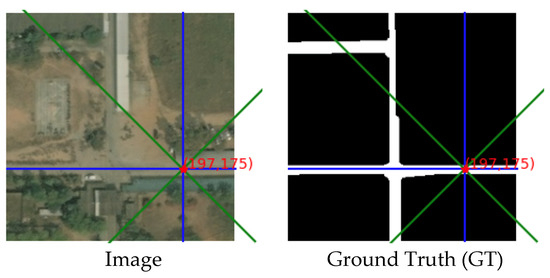 In Figure 24, the abscissa also represents the pixel points in two-point groups of the RCCA module: and . In this rotated crisscross-shaped road example, the rotated crisscross-shaped sampling area contains more road pixels. We can obtain the same conclusion as the last example that the distribution of the entire energy value is highly similar to the distribution of the ground truth.