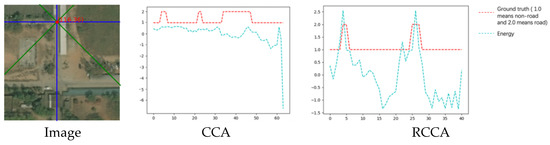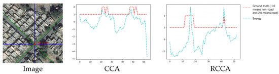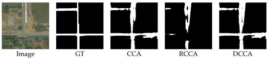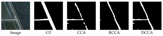 Figure 25 shows that the result of the RCCA module is better than that of the CCA module. The RCCA module truly predicts more road parts, which means that in this case, the RCCA module can focus on more road areas. In this rotated crisscross-shaped road image, the DCCA module can distribute a higher weight to the RCCA module according to the energy map, which can let each road pixel receive more relation information from the road part. In this way, the geometric information can be considered largely in the attention process, which is the reason why the result of the DCCA module can retain the advantages of the RCCA module.