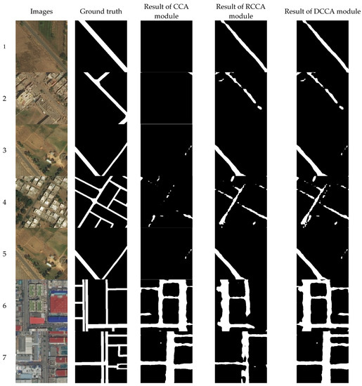 In the experiment, the indicators of the DCCA module are 4% higher than those of the CCA and RCCA modules. By analysing specific samples, the DCCA module combines the merits of the CCA module and RCCA module and has better results for road extraction with a richer directionality. In general, the DCCA module has a breakthrough in road extraction by exploiting geometric road directionality information.