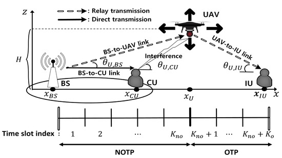 At a time slot () in OTP, BS transmits a signal to CU, and UAV relays the received data from BS in NOTP to IU. Therefore, the SINRs at CU, , and IU, , at a time slot in OTP can be given by