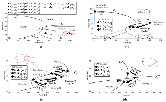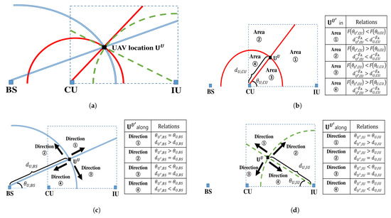 and represent that cannot satisfy the constraints (19a) and (19b) due to poor channel conditions in BS-to-UAV and UAV-to-IU link, hence resulting in and respectively. Therefore, to find the feasible UAV location , should be increased along a circle or should be decreased along a line in Figure 2c (when ) and Figure 2d (when ). This is because , and are increasing functions of , and , respectively.