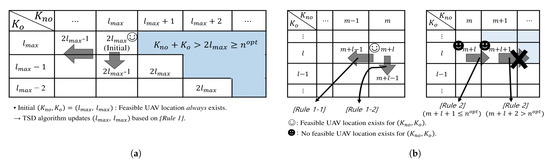If a feasible UAV location exists for , update as and check the existence of feasible UAV location for and , obtained by downward and leftward movements in Figure 4 to decrease and , respectively.