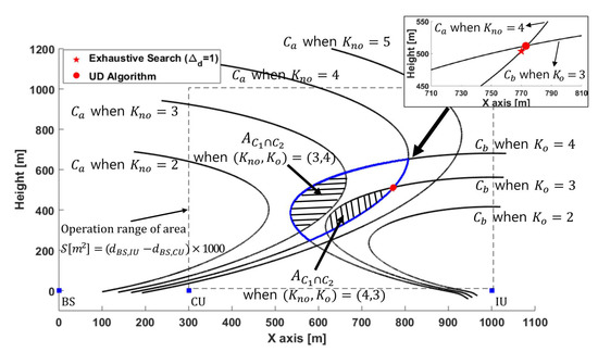 Figure 5 represents feasible combinations of and formation of , and compares by UD algorithm with that by exhaustive search of , where , [m], [m] and [bit/Hz]. When , starts to appear, but TSD algorithm concludes resulting in , even though also provides . This is because maximizes for given . TSD algorithm reduces the feasible UAV locations significantly, and UD algorithm successfully determines close to that from the exhaustive search of .
