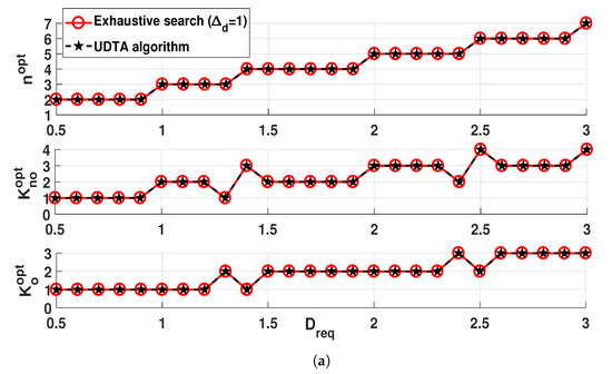 To determine the number of UAV locations for an exhaustive search, we consider that a grid is superimposed over the operation range (i.e., dashed rectangular in Figure 2a) with lines separated by [m]. As a result, the number of UAV locations to be considered increases as decreases. Total computations for an exhaustive search is derived as . is the number of UAV locations within the operation range of S [], where is rounding up to the nearest integer. is the number of combinations for to find from initial = (1,1). Hence, indicates that locations for their feasibility need to be considered for each time allocation . On the other hand, the UDTA algorithm requires at most number of computations to find and . On TSD algorithm, computations are required in (25) to determine from . To determine , computations are required in (26) from , where only two UAV locations (i.e., initial and first feasible locations in [Step 1] on UD algorithm) are considered for each time allocation . Similarly, there are at most 2 combinations for to find from , hence resulting in computations. In the UD algorithm, the total number of computations in (20) or (21) is less than 10, which is derived from simulations and reasonable due to dramatically reduced search area within by the proposed algorithm. As a result, the UDTA algorithm requires much fewer UAV locations and combinations to be considered for and over exhaustive search algorithm, thereby reducing computational time and effort significantly.