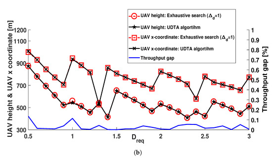 Figure 6 represents , , UAV location, and throughput gap with respect to for same , in Figure 5. The UDTA algorithm finds and UAV location close to optimum with negligible throughput gap. increases as increases to set a reliable relay connection. For a given , UAV should be placed lower and close to CU as increases. Even though this UAV movement increases the interference to CU, it is necessary for reliable relay transmission in BS-to-UAV link. For example, Figure 6a represents that is required for . When , UAV can be placed very high and remote from CU. As increases, however, UAV moves towards BS to set a reliable BS-to-UAV link. Lastly, the throughput gap between the proposed algorithm and exhaustive search is less than 0.1 (%) for entire range of , hence, it demonstrates that UDTA algorithm successfully determines and with negligible throughput gap from the exhaustive search of .