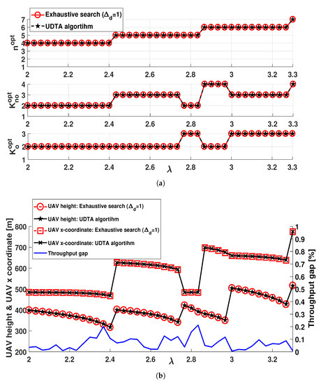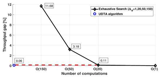 Figure 8 shows the throughput gap of exhaustive searches with respect to the number of computations. It is obvious that the throughput gap increases as increases, due to the reduction on the number of UAV locations considered for searching and , compared with . As aforementioned, the UDTA algorithm significantly reduces computational time to find and due to the time-efficient determination of based on and , and small derived from . Therefore, it provides optimal solution for JUDTAP, and achieves much less computations of with negligible throughput gap over the exhaustive search of even .