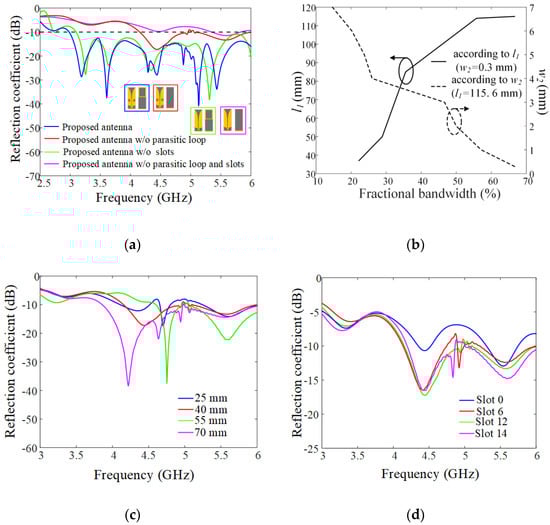 Parametric studies on the rectangular slots and the parasitic loop: (a) reflection coefficients according to the antenna sensor components; (b) fractional bandwidth according to the parasitic loop structure; (c) reflection coefficients according to h3; (d) reflection coefficients according to N.