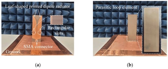 Figure 2a presents the reflection coefficients in accordance with the existence of the antenna elements (the parasitic loop and slots) to observe the effects on the impedance matching characteristics. We simulated the proposed antenna when each element was removed one by one. The resulting −10 dB fractional bandwidths at the center frequency of 4.5 GHz are 66.7% (the proposed antenna), 41.1% (without the parasitic loop), 64.4% (without the slots), and 10.4% (without the slots and parasitic loop). In particular, the stand-alone dipole with the parasitic element drastically enhances the impedance matching characteristics, meaning that we can further analyze the parametric study for the shape of the parasitic loop. Figure 2b illustrates the fractional bandwidth according to the ratio of the parasitic loop thickness and length. The solid and dashed lines indicate the bandwidth results when considering a thickness of w2 and a loop length of l1. As the loop length, l1, increased from 35 mm to 115.6 mm, the fractional bandwidth was gradually enhanced. The wide fractional bandwidth can be obtained with the narrow width of 0.3 mm when w2 varies from 0.3 mm to 7 mm. This is because the strong mutual coupling strengths between the radiator and the parasitic loop can adjust the input impedance of the proposed antenna in the low- and high-end frequency band. Thus, the maximum fractional bandwidth of 66.7% can be obtained when l1 is 115.6 mm and w2 is 0.3 mm. Figure 2c,d show the reflection coefficients in accordance with the slot height, h3, and the number of the slots, N. When changing the slot height, h3, from 25 mm to 70 mm, the resonant frequency band became down-shifted. This is because the current path in the radiators can be adjusted by the slot height, which affects the resonant frequency band. In addition, the number and size of the slots can tune the reactance values in the high-end frequency band over 5 GHz, where the slot acts as the capacitive loading in the radiators. Through the parametric studies, N of 12 and h3 of 40 mm were determined to improve the impedance matching in the high-end frequency band. The optimized design parameters were obtained using the CST Studio Suite [15], and the detailed values are listed in Table 1. To confirm the feasibility of the proposed antenna sensor, it was fabricated and measured in a full anechoic chamber.