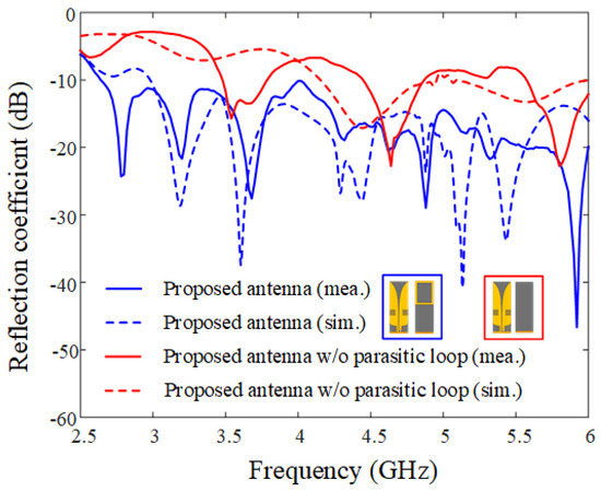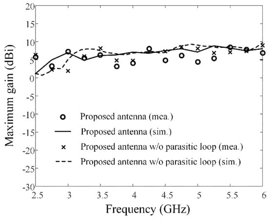 Figure 3 shows photographs of the fabricated antenna sensor printed on the TLY-5 substrate for high-power durability; the proposed antenna sensor is directly fed by an SMA connector. Figure 4 presents the measured and simulated reflection coefficients; it can be seen that the results agree well with each other. The maximum values for the measured and simulated reflection coefficients are −10.1 dB and −10.9 dB from 3 GHz to 6 GHz, respectively. The measured fractional matching bandwidth was improved from 55.6% to 66.7% when the parasitic loop element was applied. Figure 5 presents the simulated and measured maximum gains of the proposed antenna in the absence and presence of the parasitic loop. The solid and dashed lines indicate the gain results of the simulation with and without the parasitic loop, while “o” and “×” markers represent those of the measurements. The enhancement of the maximum gain at 3 GHz is 3 dB, because the parasitic loop element can improve the impedance matching characteristic in the low-end frequency band. With the parasitic loop element, the improvements of the measured and simulated radiation efficiencies at 3 GHz are 30% and 40% due to the enhancement of the matching characteristics in the low-end frequency band. A slight gain discrepancy occurs due to the measurement setup alignments and fabrication errors. Figure 6 shows the simulated and measured radiation patterns of the co- and cross-polarizations in the zx- and zy-planes. The measurements agree well with the simulations, and the measured half-power beamwidths in the zx-plane are 51.2°, 105.2°, and 62° at 3 GHz, 4.5 GHz, and 6 GHz.