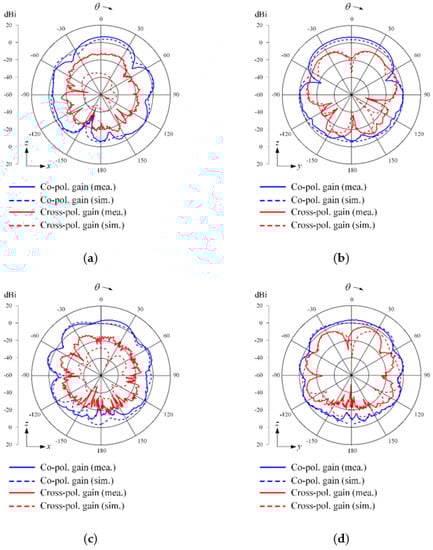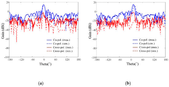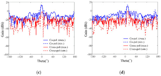 Figure 10 shows the beam steering characteristics with steering angles, θ0, of 0° and 15° at 4 GHz and 5 GHz. The solid and dashed lines indicate the measurements and simulations, and the blue and red lines denote the radiation patterns of the co- and cross-polarization. The measured and simulated results are well matched to each other. The measured bore-sight array gains of the co-polarization are 13.4 dBi and 13.7 dBi at 4 GHz and 5 GHz, and those of the cross-polarizations are −4.9 dBi and −3.4 dBi, respectively. When the beam is steered at the steering angle, θ0, of 15°, the maximum measured array gains of the co-polarization are 12.2 dBi and 10.3 dBi at 4 GHz and 5 GHz, respectively. Moreover, the co-and cross-polarization level differences at the angle of the maximum gains are 14 dB at 4 GHz and 11.4 dB at 5 GHz. Note that these beam steering results were calculated considering the ideal gain increment of the 11 elements from the bore-sight gains of 3.5 dBi at 4 GHz for the center array element. In addition, the measured back lobe levels seem to be higher than the simulated results because the extra obstacles, such as a RF cable and a positioner structure in the measurement setup, caused high back lobe levels. These results confirm that the proposed array antenna sensor can be applied to high-power jamming applications, as it is capable of achieving essential and required array performances. We also compared the antenna characteristics between the proposed array and the reference wideband arrays; the detailed explanations are listed in Table 3.