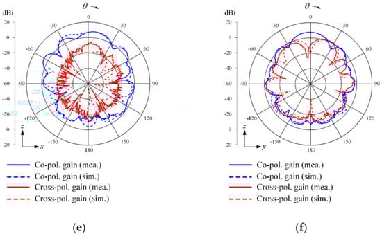 2D radiation patterns: (a) zx-plane at 3 GHz; (b) zy-plane at 3 GHz; (c) zx-plane at 4.5 GHz; (d) zy-plane at 4.5 GHz; (e) zx-plane at 6 GHz; (f) zy-plane at 6 GHz.