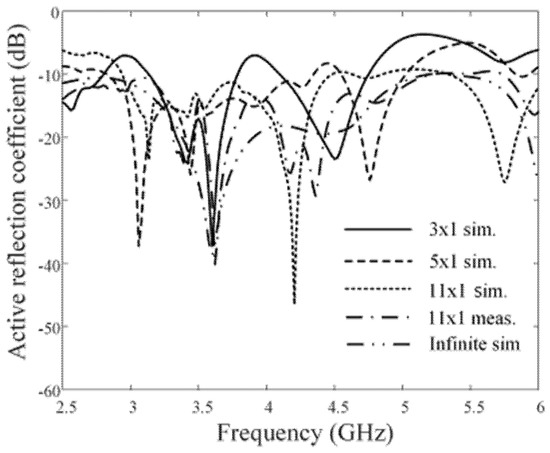Figure 8 shows the comparisons of the simulated and measured ARCs according to the number of array elements. The solid, dashed, dotted, and dash-dotted lines indicate the simulations of the 3 × 1, 5 × 1, 11 × 1, and infinite uniform linear arrays, respectively. The dash-dotted-dotted line represents the measurement of the proposed 11 × 1 linear array antenna sensor. As the number of the array elements increased, the resulting ARCs decreased, especially in the high-end frequency band. Regarding the adjustment of the loop dimension for the periodic structure, the mutual coupling was decreased between the adjacent elements to enhance the ARCs. The average values of the simulated ARCs from 4.5 to 6 GHz are −11.5 dB, −12.2 dB, −13.4 dB, and −16.2 dB for the 3 × 1, 5 × 1, 11 × 1, and infinite linear arrays, respectively, while that of the measurement for the proposed array is −14.7 dB. Figure 9 shows the simulated and measured mutual couplings between the center element (Port 6) and the other elements. The measured and simulated average values of the mutual coupling results are −49.3 dB and −51 dB. We examined the mutual couplings (S2, 1, S3, 1, S4, 1, …, and S10, 1) of the 11 × 1 array; the average value of the simulation was −29.8 dB. In addition, the beam steering performance, which is another essential array characteristic for high-power jamming applications, were investigated by measuring the active element patterns (AEPs) of the proposed array. To measure the AEPs, each array element was excited, while the other ports were terminated with 50 Ω loads. Then, the AEPs for all ports were weighted and summed to calculate the steered array gains [19,20]. Herein, we assumed that the feeding network with the phase shifters was well designed with ideal characteristics. The array gain was calculated using the AEPs of all ports based on the following equation: