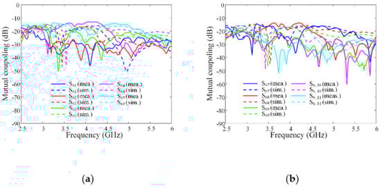 The measured and simulated mutual couplings: (a) the mutual couplings for port 1 to port 5; (b) the mutual couplings for port 7 to port 11.