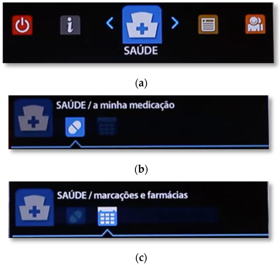 Breakdown of the main menu into areas and their tabs: (a) Menu—Health area. (b) Health area—“my medication” page. (c) Health area—“appointments and pharmacies” page.