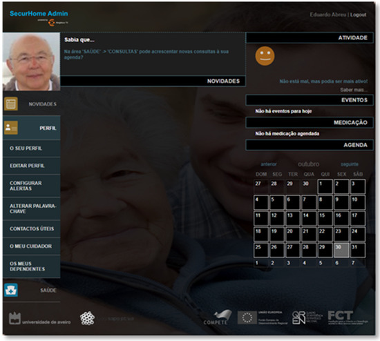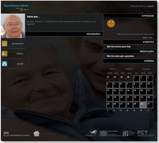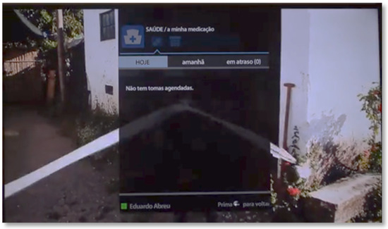 The SecurHome TV application is aimed at elderly users, and its main objective is to monitor the activity of seniors during their interactions with television content and with the application itself. This application also allows the presentation of reminders related to medication taken by the elderly and the sending of emergency alerts to the caregiver (Figure 1).