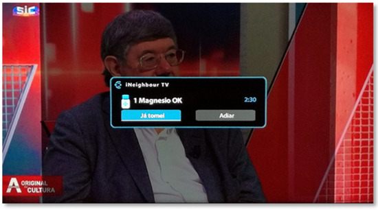 The SecurHome TV application is also associated with medication reminders, which are materialized in notifications that appear on the TV screen. These notifications appear at the time stipulated by the caregiver, in the SecurHome Admin application, for each medication that the respective dependent should take (Figure 6).
