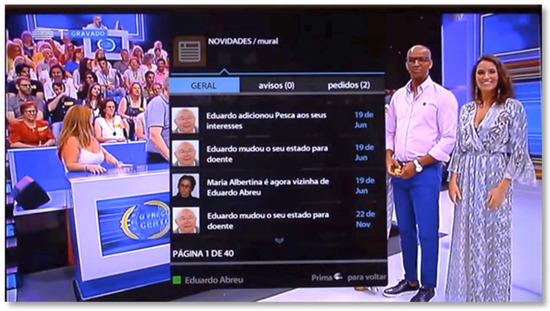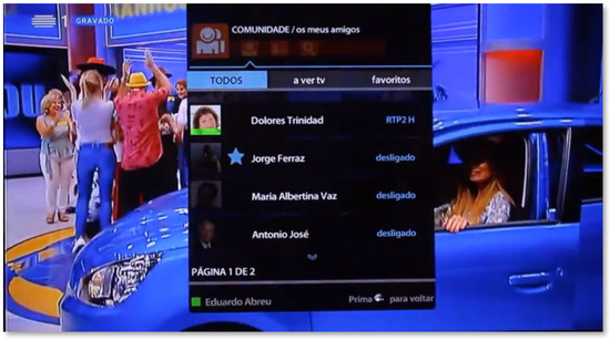 The features offered by the Community area meet the concept of social networking, but in a simplified way. In this area, it is possible to create and manage a list of friends, mark favorites, and see who is watching television and which programs are being viewed at that moment (Figure 8). In this case, a user can preview the channel his friend is watching and even switch to that channel. At the same time, it is possible to view the personal profile, which includes basic information such as location, age, interests, and skills. It is also possible to make status changes (connected, for those who wish to make the channel they are currently watching available; busy, when the senior wants a greater degree of privacy; and sick). In this area, it is also possible to search and add friends, using a search system, by name, interest, or skill.