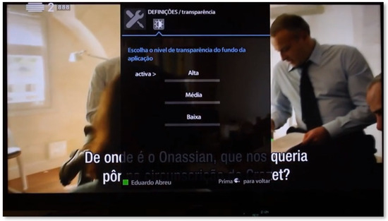 On this page, the user has the possibility to adjust the transparency level of the system according to his preferences. This is quite important, considering the overlaps that may arise from the multiplicity of images and actions taking place on the screen. Thus, each user can make the panels of the application have: (i) a completely opaque background, in order to be able to dedicate full attention to the functionalities of the system; (ii) intermediate transparency, where it is possible to see penumbras of the background television programming; and (iii) substantial transparency, for users who do not have difficulty with the simultaneous viewing of a broadcast and the use of the SecurHome TV application (Figure 10).