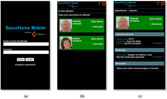 As shown in Figure 12a, the caregiver needs to log in to the SecurHome Mobile application using their email or username and the password provided by the system. If the user forgets his password, he can always retrieve it via the link provided on this initial screen. In the dependents area Figure 12b, the caregiver can access the dependents’ statuses (on or off) and see if there are any warnings associated with them. To find out more information about a specific dependent, the caregiver needs to click on him/her. In the details area of each dependent Figure 12c, the caregiver can find out more information about the warning associated with the dependent (if the background is green, there are no warnings), and his television consumption and medication data. In this area, it is also possible to access an interface for writing messages to the dependent.