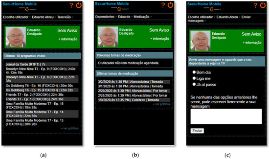 In the television consumption area (Figure 13a), the caregiver can view the last 10 programs watched by the dependent. In the medication area (Figure 13b), the caregiver has the possibility to identify the dependent’s next medication to be taken, and the status of the latest medication (taken or untaken). In the message area (Figure 13c), the caregiver can choose to send a predefined or personalized message to his dependent.