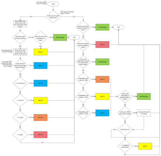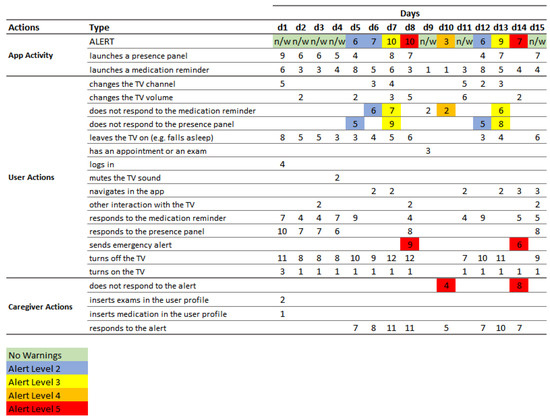 With the validation, it was possible to verify that the algorithm is able to detect most of the foreseen situations that can indicate a potential problem with the senior. However, as the algorithm is based on the senior’s activity, historical data of a minimum of 5 days is needed as a basis for analysis. Additionally, if a medical appointment or exam is not registered by the caregiver in the system, the algorithm can create a false alarm if in that period of time it is normal for the elderly person to have registered activity, since it cannot understand that the elderly person is not at home. Likewise, if the senior suddenly changes their routine (e.g., changing TV viewing periods), the algorithm may initially detect false alerts, since a deviation from the daily activity pattern is momentarily created.
