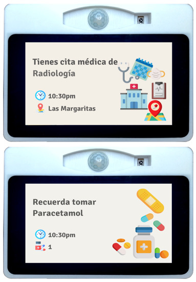 A new API was developed by the UC3M partner considering the structure of the SecurHome TV API to support a sensory device for homes (SDH) [30] based on an IoT system, which collects information non-invasively through a network of sensors. It uses a set of sensors that allows it to collect information about the user’s environment and physical behavior. This data is stored, and the IoT system uses the data to detect anomalies in the user’s behavior and notify his caregivers. In addition, with the use of this API, the device is able to know the user’s medication and medical appointment routines, being able to generate notifications, either to remind them to take medication or that they have a medical appointment. This last reminder is done twice, the first time the day before the appointment, and the second time two hours before the appointment. It is important to mention that the time of each reminder can be modified. Some examples of these notifications are shown in Figure 21.