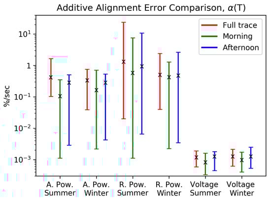 Figure 2 provides the answer to both of these questions for the analyzed set of customer measurements. The values computed are grouped by season, time of day, and electrical measurand, resulting in 18 clusters, each comprising 30 values of . Energy consumption behavior is subject to daily profiles and weekly rhythms. For instance, weekends show different usage patterns than weekdays. Therefore, there is some inherent nonstationarity in grid-related measurements covering long time windows of more than a few hours. To investigate the effect of time of day, we carry out our analyses using extracts from the traces corresponding to the 2–5 am period from Monday through Friday, and the 1–4 pm period from Monday through Thursday (Friday is excluded as it can behave differently in Central Europe since shorter working days in many businesses on Friday are common). These are denoted as ‘morning’ and ‘afternoon’ in Figure 2. The averages, minima and maxima of these clusters are shown by the ‘X’ mark and the endpoints of the vertical lines in the figure. Among all the clusters, the morning traces produce the lowest average Additive Alignment Error, while the full trace produces the highest average, with the exception of the summer voltage measurements. Additionally, the minimum Additive Alignment Error obtained from the full trace is higher by one or two orders of magnitude than for the partial traces when looking at the power traces.
