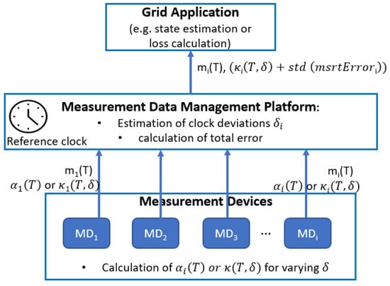 The trace-based approach can in principle be implemented for online estimation of the Additive Alignment Error. Online estimation here means that this error is provided by a data management platform together with a batch of the measurement samples for the interval durations T after a period of assumed stationarity, e.g., normally during few hours. Figure 3 illustrates the context in which such a data management platform operates. However, such calculations of the Additive Alignment Error require high-resolution measurement data (e.g., 1-s), and since these high-resolution measurements for bandwidth and loading reasons are not transferred to the data management platform, such calculations can only be performed at the measurement device itself. On the other hand, the measurement device does not know about the precision of its clock. Therefore, each measurement device would be required to compute for a range of values using the sliding window approach. Calculating would require the additional step of performing linear regression on the values of . The Data Management Platform then needs to receive the value of for each measurement device i, or alternatively a set of values of values of for, e.g., is 1 to 20 s.