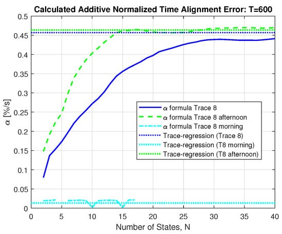 The solid blue curve in Figure 4 shows the resulting behavior of the calculated Additive Alignment Error from Equation (9) when fitting an MMP-GapT model with increasing number of states N to a specific trace containing a reactive power measurement.