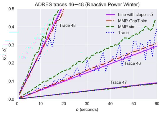 Figure 5 shows the results for three traces from different households of a reactive power measurement collected in winter. The figure shows how the traces compare to results from simulations of the MMP and MMP-GapT models. The choice of the three traces presented is illustrative of the range of results seen in the data set. Starting with Trace 47, the figure shows that both models and the straight line approximation provide a very good match for the result from the trace over the range of values. For Trace 48, the relative error grows more rapidly with increasing time offset , namely by for each additional second of interval misalignment. In this case, the MMP model provides a slight overestimate, while MMP-GapT and the resulting computed linear approximation more closely match the result from the trace. Lastly, for Trace 46, which exhibits much fluctuation for , the MMP-GapT model provides a good match, while the MMP model simulations overestimate the relative error over the range of values.