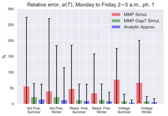 For each trace i considered, we first calculate by the slope of the linear regression line of the empirical for in the range 1 to 20 s. Both the MMP and MMP-GapT models are then fitted to the trace and simulated to compute the same metric from the simulated traces from the model. Lastly, we compute the Additive Alignment Error from the matrix-algebraic formula in Equation (9) for the MMP-GapT model. The traces are aggregated by measurand, season, and time of day to investigate how significant these factors are with respect to model accuracy, resulting in six groupings of 30 traces each. For each grouping, we show the minimum, maximum, and average absolute deviation of the set of for the traces in the cluster. To investigate the effect of time of day on the accuracy on the models, we consider the same partial traces as the ones in Figure 2. These results are shown in Figure 6. The solid-color bars represent the mean of the , and the lower and upper endpoints of the lines represent the minimum and maximum of the set of , respectively. For each of the groupings, a small subset of traces (approximately 6%) is excluded from the results due to numerical problems in the data fitting procedure used to construct the matrices for the Markov model. However, this is unlikely to produce qualitatively different results; nevertheless, a closer examination of the fitting procedure will be left for future work.