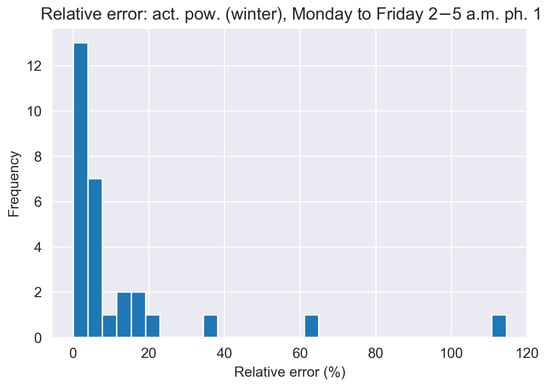 Histogram of relative error calculated from matrix analytic calculation based on MMP-GapT model for active power winter morning traces shown in Figure 6.