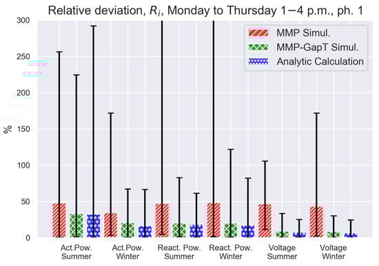 Same analysis as in Figure 6, but for afternoon traces. Note that vertical bars for the MMP simulations of reactive power summer and winter were clipped for improved presentation. Maximum values for these MMP simulation groups are 347% and 472%, respectively.