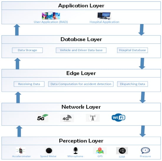 The RAD architecture is composed of five distinct layers: apps, database, cloud, network, and perception. The perception layer in the described RAD architecture is responsible for communicating with the smartphone’s sensors. The perception layer’s principal function is to gather data from the sensors. The collected information is based on sound, speed, pressure, gravity, and vehicle location.After data collection, it is passed to the network layer for processing. The network layer’s function is to connect the edge to the perception layer. The network layer is based on 4G, 5G, or Wi-Fi to transfer the perception layer to the cloud layer. The presented algorithm is embedded in the edge layer, detecting the accident and performing the analysis based on a defined threshold. If any accident is detected, the nearest hospital and ambulance are informed, and data are forwarded to the database layer. Finally, the database layer saves the data in the database (i.e., accident information, driver information, vehicle information, and hospital information). Collected data are then forwarded to the application layer for further process with the help of smartphones and web-based systems for the driver and hospital.