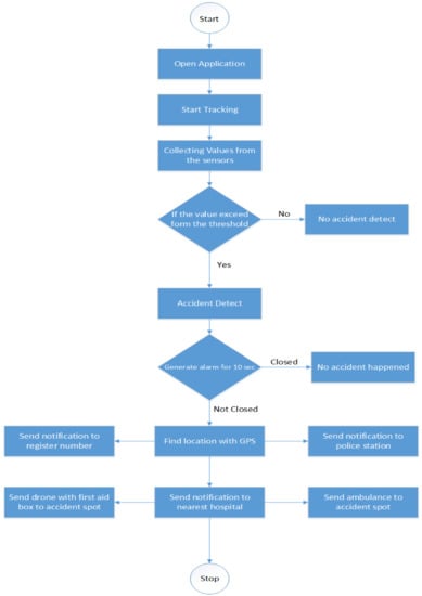 The cloud identifies the accident with the help of Equation (1) by processing the collected data. The alarm is activated when the accident is identified. There are 10 s with the user to deactivate the alarm to avoid false accident reports. If the alarm is not deactivated within 10 s, the nearest hospital is informed with an emergency message for further action. Algorithm 1 describe detection of accident.