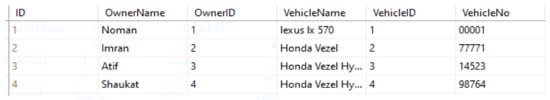 This database contains information about the vehicles. For example, owner name, owner ID, vehicles Name, vehicles name, and vehicles ID. Figure 3 shows the vehicles database.