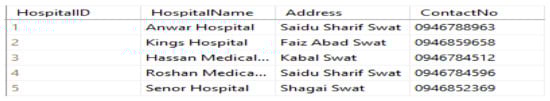 For emergency services, the system needs information about hospitals. After accident detection, the system forwarded the notification about an accident to edge cloud, and the edge cloud informs the nearest hospital for further action. Figure 4 shows hospitals database.