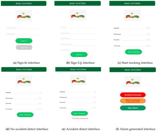 As mentioned earlier, the proposed system has two phases: the android application is a smartphone used to detect an accident, while the web-based system is used for hospital notification. Implementation of the accident detection phase Java language is used for programming, and the android studio is used for android application development. After installation of an application on a smartphone, the user needs to register with different information. Once the registration process is completed, the applicant can log in to the system with their user name and password. After logging into the system, the user clicks on the start tracking button to transmit and record data. The application continuously collected the data from the sensors of the smartphone and forwarded it to the edge. If the value exceeds the defined threshold, the edge identifies the accident and generates an alarm for 10 s. Figure 5 shows the interface of the Android application. The android application contains the mentioned below activates.