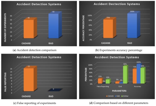 The OnStar system [] is used for the comparison with the proposed system RAD. OnStar system is developed by General Motors (GM) for assistance on roads. The system is based on sensors embedded in the vehicle which detect an accident and inform the rescue team. OnStar system is hardware base which is embedded in-vehicle sensors. The system only work in GM vehicles and cannot be embedded in other cars. Figure 7d shows the simulation results.