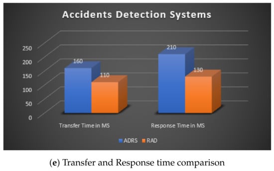 The ADRS system [] is selected for comparison in terms of response time. The ADRS uses the same sensors as used in RAD system. ADRS is based on cloud computing which is far as physical, which can lead to high latency. As a car accident is a severe case, therefore real-time detection is very important. RAD system is based on edge computing which processes the data near to the foundation and prioritizes the traffic in the network. Edge computing minimizes data flow from and to the primary network, leading to low latency and high overall speed. Figure 7e shows the simulation results.