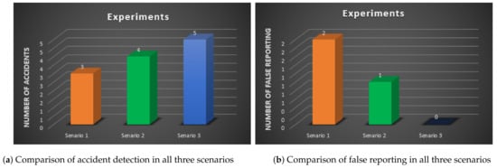 In Scenario 1, only three accidents are detected out of five. In Scenario 2, only four cases are detected out of five. Finally, in Scenario 3, all five accidents are detected out of five. In Scenario 3, the accuracy of the proposed system is 90%. Figure 8 shows the accuracy and false reporting of all three scenarios.
