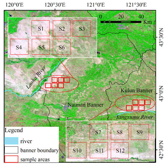 Horqin Sandy Land is located in the southeast of Inner Mongolia Autonomous region, northern China, with a latitude of 43°2′ N and longitude of 120°25′ E, one of the areas most seriously affected by desertification in China. This area pertains to temperate semi-arid continental monsoon climate. To be specific, the eolian sandy soil is widely distributed in this area, the average annual temperature is nearly 6 °C, and the average annual precipitation is about 350 mm, mainly in summer. The vegetation patterns are patchy primarily, composed of Agriophyllum squarrosum, Corispermum hyssopifolium L., Coragana Microphylla, Artemisia halodendrom, A. frigida, Cleistogenes squarrosa, etc. The sample areas of this study include Naiman Banner and Kulun Banner in the central and southern part of Horqin Sandy Land, located in the east bank of Laoha River and the north bank of Yangxumu River, respectively, which are typical areas of sandy range land in Horqin (Figure 1). On the background of sandy land (e.g., mobile dunes, semi-mobile dunes, fixed dunes, and semi-fixed dunes), 12 rectangular sample areas with an equal area (24 square kilometers) were selected (Figure 1 and S1–S12 in Figure S1).