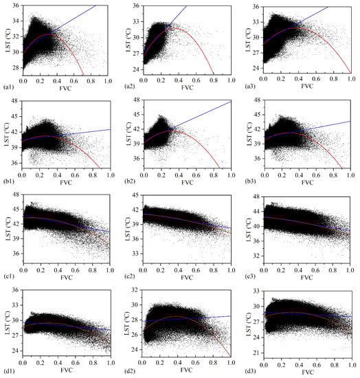 According to the linear and binomial fitting results of FVC and LST, the FVC of S1–S6 showed a positive correlation (r = 0.49) with LST at P1. According to the results of binomial fitting (R2 = 0.43), the fitting curve showed a turning point when FVC = 0.29. That was, when FVC > 0.29, LST decreased with the increase in FVC (Figure 2(a1)). FVC of S7–S12 showed a positive correlation (r = 0.64) with LST. As revealed from the results of binomial fitting (R2 = 0.50), when FVC = 0.35, the fitting curve showed a turning point, and when FVC > 0.35, LST decreased with the increase in FVC (Figure 2(a2)). The overall results of S1–S12 were consistent with the results of the first two groups, a positive correlation was identified between LST and FVC (r = 0.43). The binomial fitting (R2 = 0.23) showed that when FVC = 0.38, there was a turning point, LST began to decrease with the increasing FVC when FVC > 0.38 (Figure 2(a3)).