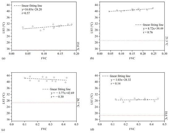 Relationship between FVC and LST at sample area scale on P1–P4 ((a), P1; (b), P2; (c), P3; (d), P4. The red dotted line is the average air temperature observed by Naiman and Kulun field stations on the same day).